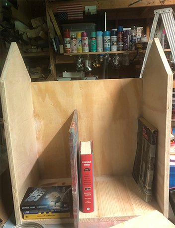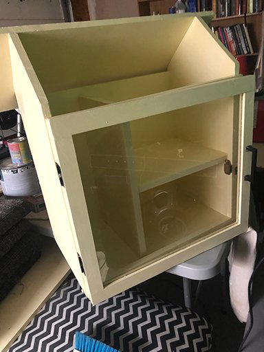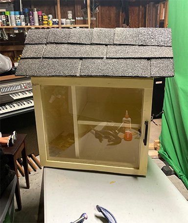 With the materials gathered, we started building the library. We cut the wood to the appropriate sizes, assembled the structure, and attached the plexiglass door. Then I rebuilt the door from scratch because the first one wasn't straight. We also painted the library to match our house.